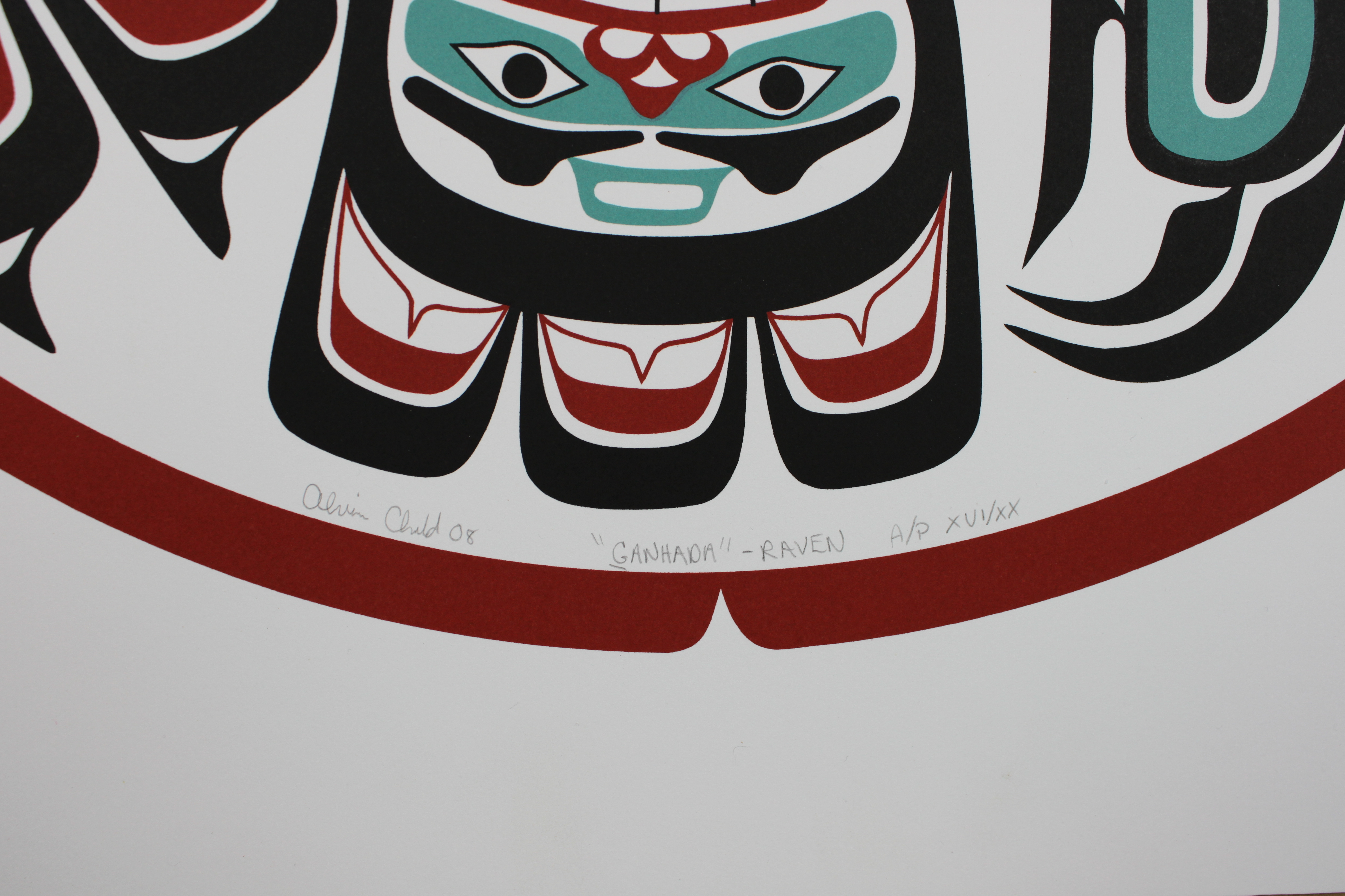 Raven is one of the most important creatures in Northwest Coast mythology and art. He is a powerful, cultural focus and symbol in many communities and to First Nation peoples along the Northwest coast of North America; both as a crest figure, and as a guardian spirit. This limited edition silk screen print titled "Ganhada" by Alvin Child was hand produced by the screen printing process. It is the only limited edition printing of this design. The artist has inspected and signed each copy in the edition. The printer has destroyed all trial copies and obliterated the printing stencils.