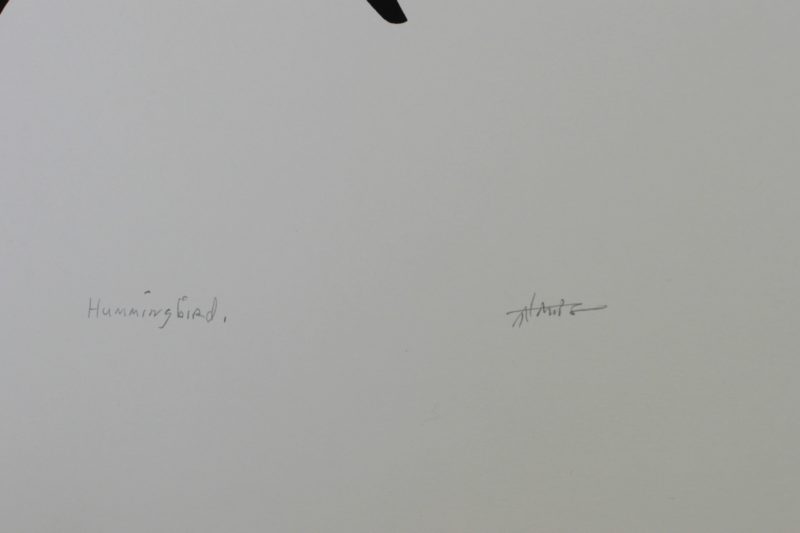 This limited edition silk screen print titled "Hummingbird" by Art Thompson was hand produced by the screen printing process. It is the only limited edition printing of this design. The artist has inspected and signed each copy in the edition. All trial copies of this edition have been destroyed and the printing stencils obliterated.