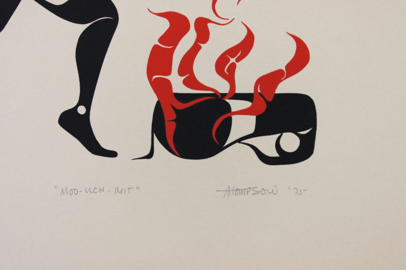 This limited edition silk screen print titled "Moo-Uch-Mit" by Art Thompson was hand produced by the screen printing process. It is the only limited edition printing of this design. The artist has inspected and signed each copy in the edition. All trial copies of this edition have been destroyed and the printing stencils obliterated.